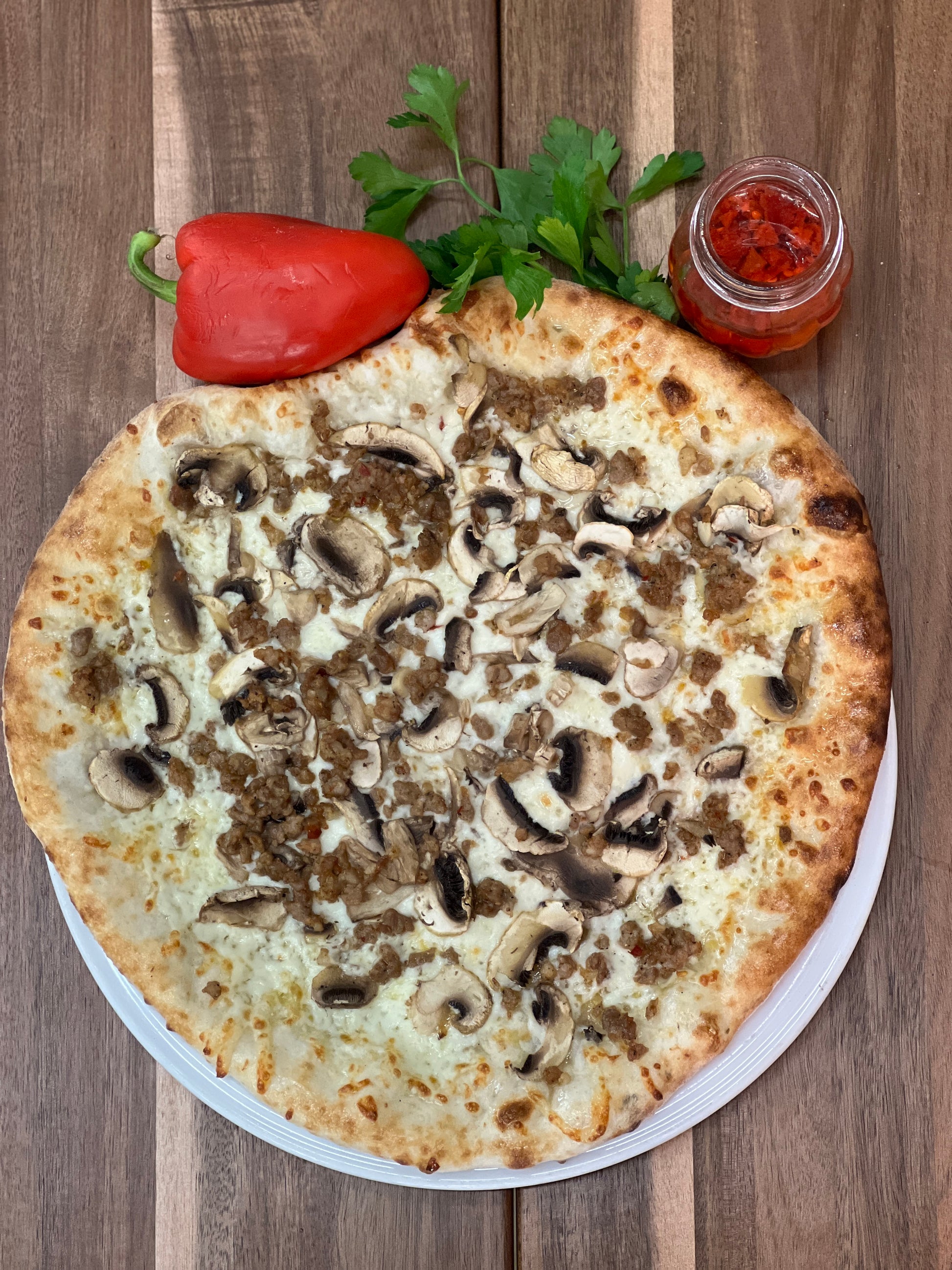 Huile d'olive extra vierge, champignons, saucisse, huile de truffe, fromage