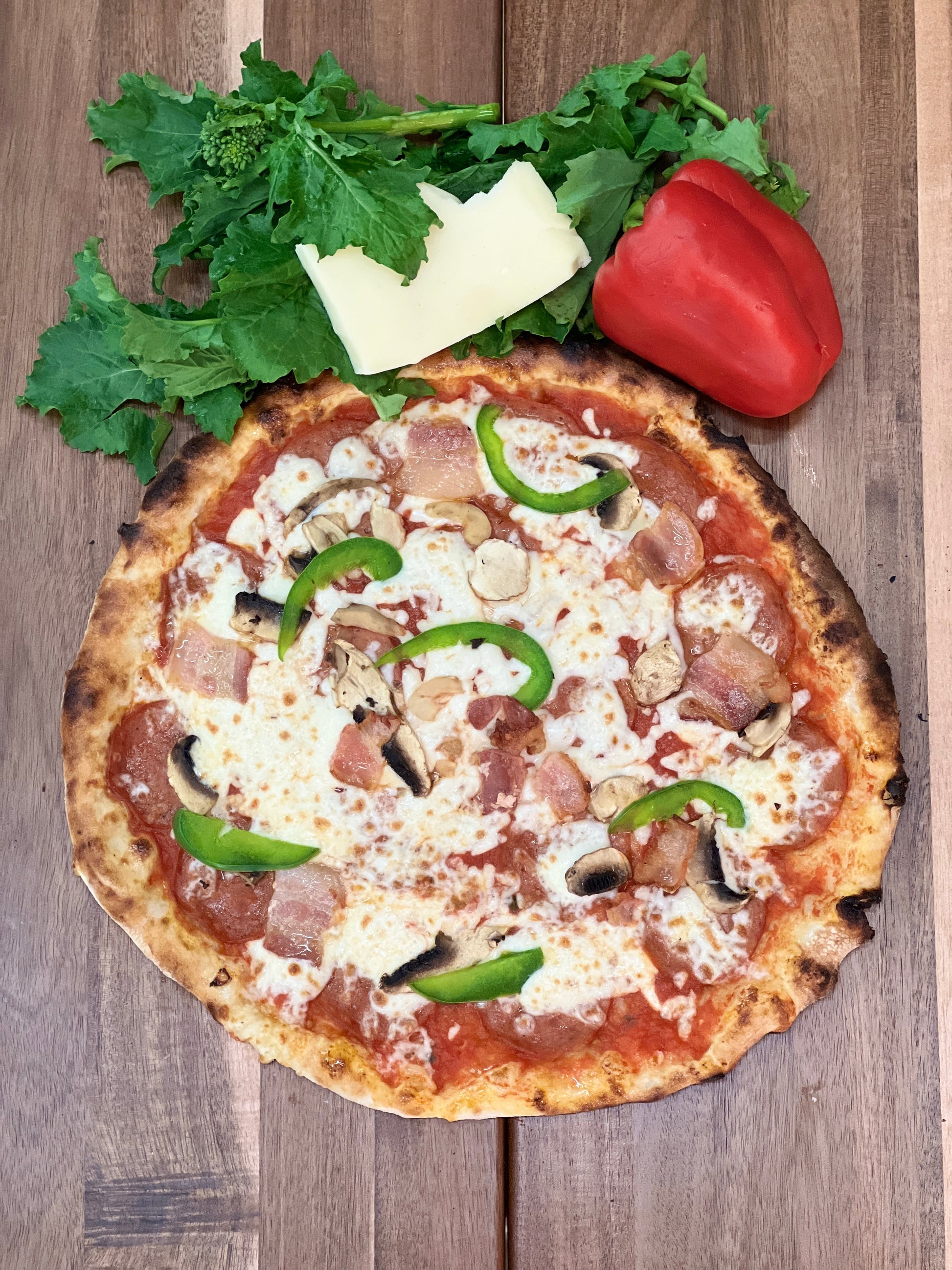 Tomato sauce, pepperoni, mushrooms, bacon, green peppers, mozzarella
